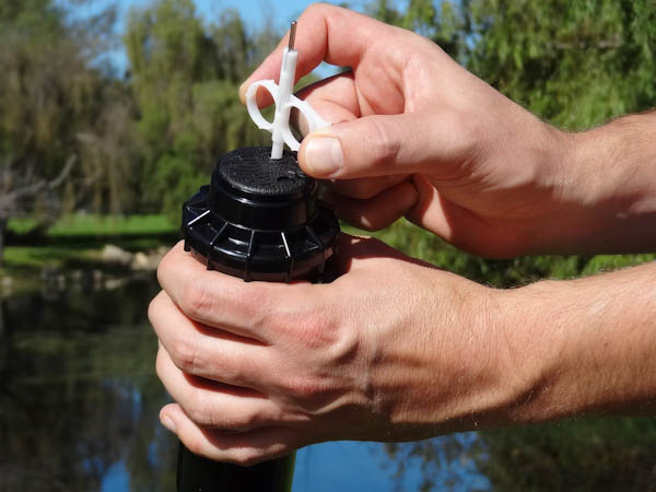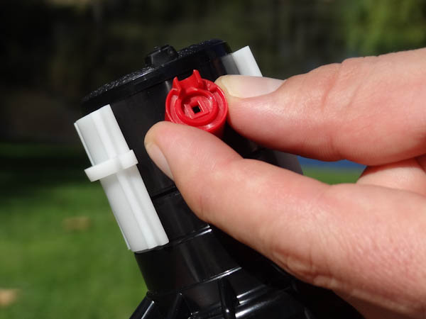 Raio/alcance do jatoInsira a extremidade de aço hexagonal da chave da Hunter no parafuso de ajuste de raio. Gire a chave no sentido horário (na direção do fluxo de água) para diminuir o raio ou no sentido anti-horário para aumentar o raio. O raio pode ser reduzido em até 25%. Atenção: se o parafuso de ajuste for girado no sentido anti-horário mais de cinco voltas completas, ele poderá ser perdido. |