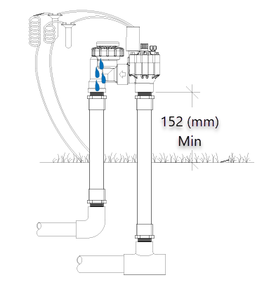 Outro motivo é que a válvula pode estar instalada no mesmo nível ou abaixo do ponto mais alto dentro desse setor. A válvula PGV-ASV deve ser instalada acima do ponto mais alto da zona que ela está controlando. Consulte as normas da sua cidade para determinar a altura exata recomendada para a válvula. Esses requisitos variam de acordo com a região, mas geralmente ficam em torno de 152 (mm) a 305 (mm).