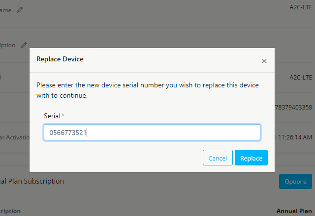 Введите серийный номер нового устройства и нажмите кнопку «Заменить».