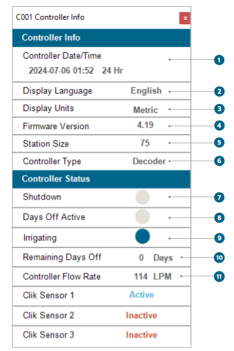 - Время/дата контроллера — текущая дата и время, установленные на контроллере.