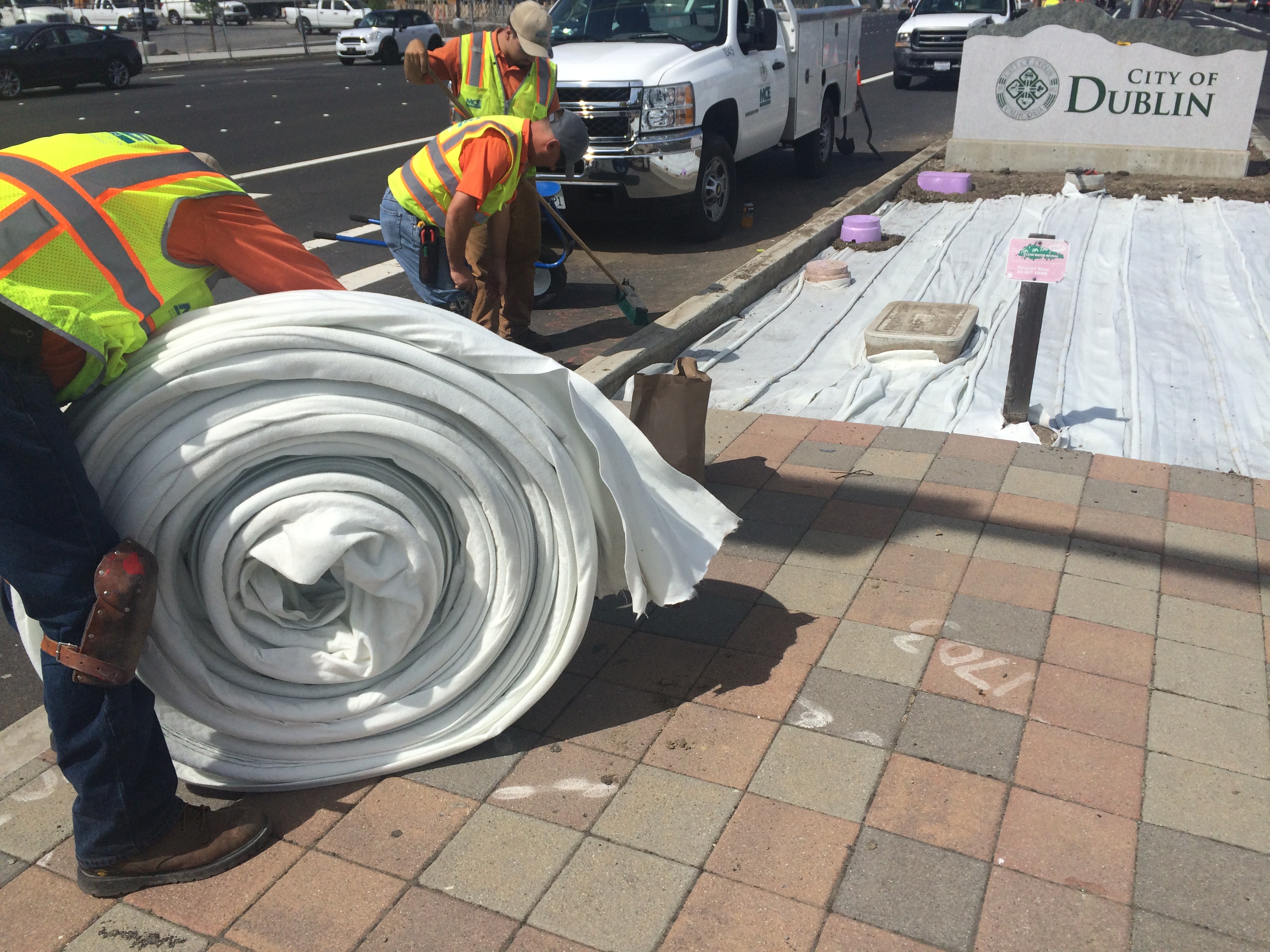 To install the product, they excavated the median landscape to an 8” depth, leveled it, and covered it with Hunter Eco-Mat. A new valve was added for zone control of the Eco-Mat. The product fit easily around several obstacles, including a sign post, electrical box, and city lights fixtures. A drain valve and an inspection box were added, and the site was backfilled with native soil.
