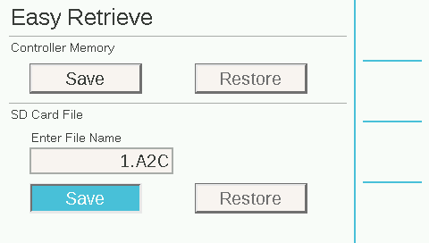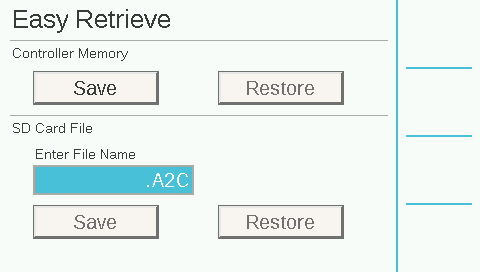 - Select EASY RETRIEVE. Dial down to the SD card selection. Enter the file name you created for the backup.
