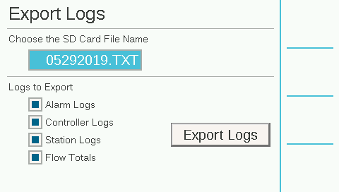 - Select and click the Export Logs button to save the file to the SD card. The card may then be inserted into a computer or other device with SD card reader, and saved or sent to another location.