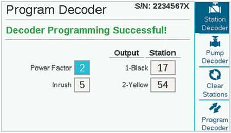 When the station outputs are all entered, press the Program Decoder soft key. After a brief pause, the message "Programming Decoder Successful!" should appear. Remove the decoder, and write the numbers on the decoder label with a permanent marker. Install the decoder at the appropriate valve location.