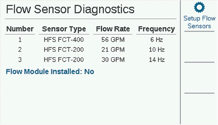Shows the configuration of each flow sensor and current flow. Frequency shows the click or pulse rate from the sensor, for diagnostic purposes.