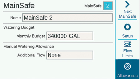 Monthly Budget: Enter the total amount on the Allowances screen in this MainSafe™ in the calendar month. If the total flow exceeds the monthly budget, an alarm message will appear on the screen. The controller will not automatically stop watering when this alarm occurs.