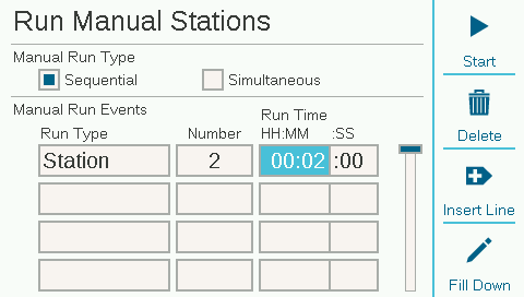 From the Home screen, the MANUAL soft key allows you to start stations/blocks, programs, and run a test program. A Manual Station or Program Start will pause any automatic watering until the Manual Program has been completed.