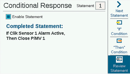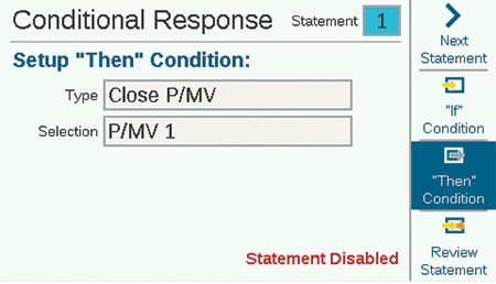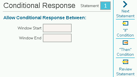 Dial to Advanced Settings and select Conditional Response. Each response has a soft key for the “If” condition, a “Then” condition or action, and “Review Statement” to verify that the complete response will meet the goal.