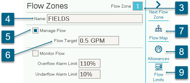 The Flow Target box is used to set the flow rate desired for the Flow Zone throughout irrigation. Enter the desired rate of flow that is best for the mainline pipe diameter (recommended at 5 feet per second or 1.5 meters per second) or a preference based on other factors.