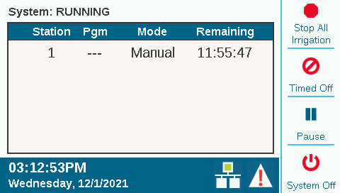 - Stop All Irrigation - Stops everything that is watering or running immediately. The controller is still in automatic irrigation mode, and will resume watering at the next start time.