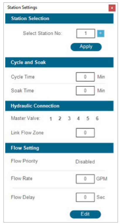 The Station settings provide the user with the ability to change the station parameters and setup for hydraulic connection, flow setting, and Cycle and Soak.