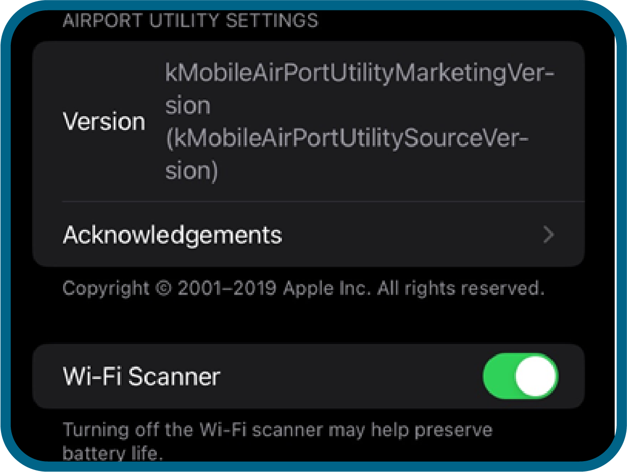 After downloading the App, navigate to Settings, locate the Airport Utility, and open it. Toggle the Allow Wi-Fi Scanner to ON.