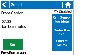 You can run an irrigation zone on demand from the controller. From the Zone Status screen, you can manually start a zone using the Run Now button. When it starts, the zone will run for the zone’s default configured run length. This can be overridden by clicking on Run Time prior to manually starting the zone.