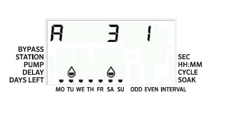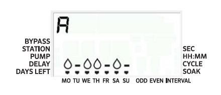 - The controller displays the active day schedule information. You can choose to water on specific days of the week, specific interval days, or odd/even days. Each program can operate using only one type of water day option.