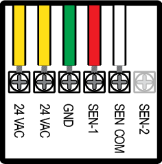 - Connect the Normally Closed or Normally Open wire from the sensor to SEN-1 or SEN-2 on the controller.