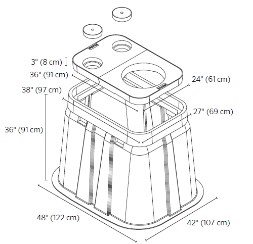 To begin the installation, configure the vault according to the specifications provided by the irrigation consultant. It must rest upon a compacted base material per the field specifications. For the vault to drain properly, it needs access to the drainage system. The drainage system must be lower in elevation than the vault’s 36" (91 cm) depth to keep water from pooling inside the vault. If the vault is set directly on gravel within the drainage system, the gravel should be compacted, and the vault should be set upon six or more bricks for stabilization. After leveling the vault, you may want to pour a concrete curb around the outside of the base and the inside corners for stabilization.