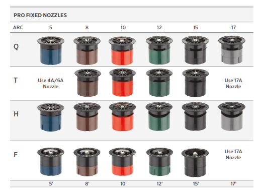 Hunter's Pro Fixed 8' (2.5 m), 10' (3 m), 12' (3.5 m), and 15' (4.6 m) Nozzle distances include the less common third arc pattern for even more design flexibility. These fixed arc nozzles are designed for accurate irrigation of a variety of landscape shapes and sizes.
