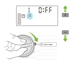 NOTE: In the Start Times dial position, the numbers 1-4 do not represent stations. The numbers represent the program start times. Each program can start up to 4 times on the set days to water. One start time will activate all stations sequentially in that program. If you want the stations to operate one time in sequential order and then not repeat, set start times 2, 3, and 4 to OFF. Multiple start times in a program can be used for separate morning, afternoon, or evening watering cycles. Start times may be entered in any order. The X-Core will automatically sort them.