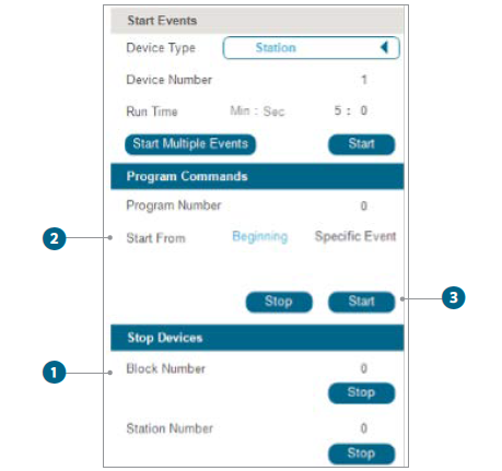 - Kontrol Düğmeleri: Blokun çalışmasını durdurmak için Durdur düğmesine, tanımlanan ayarlara sahip belirli bir blok için sulamayı başlatmak amacıyla Başlat düğmesine basın.